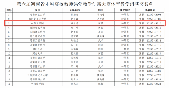 近日,第六届河南省本科高校教师课堂教学创新大赛(体育教学组)获奖名单正式公布。体育部康学艺老师凭借精妙的课堂设计、扎实的教学技能和突出的身体素质,从众多参赛教师中脱颖而出,荣获大赛特等奖。